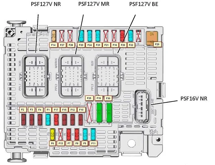 R6 | – | Blocage électrique du volant – boîtier de protection – boîtier de contrôle de la portée des phares – pompe à additif – calculateur d’aide au stationnement en ville – enrouleurs de ceinture de sécurité réversibles – calculateur d’assistance au maintien dans l’espace – connecteur de diagnostic – contacteur de niveau de liquide de refroidissement moteur – calculateur de direction assistée – unité de commutation intelligente |