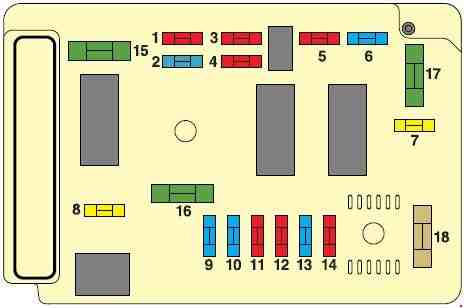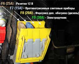 - Éléments exécutifs du calculateur moteur : Chauffage du capteur d’oxygène ; Alimentation de l’injecteur essence ; Alimentation de la bobine d’allumage ; Électrovanne de purge de l’adsorbeur (vapeurs de carburant du réservoir) 30 A