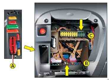 Section A – pinces et fusibles de rechange, B et C – tableaux de fusibles. Ici aussi, deux options de placement des éléments sont possibles.