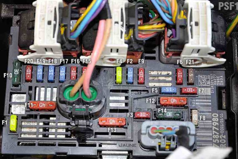 V F10 15A — Alarme — Bloc de clés au volant, interrupteurs d’éclairage et d’essuie-glace F11 15A Contacteur d’allumage basse tension F12 15A — Bloc mémoire de réglage du siège conducteur — Tableau de bord — Témoin de débouclage de ceinture de sécurité — Calculateur de climatisation F13 5A Panneau de service — Module de fusibles compartiment moteur PSF1 — Calculateur d’airbag — Panneau de commande de climatisation F14 15A — Kit mains libres — Amplificateur Hi-Fi — Système d’aide au stationnement — Mémoire de réglage du siège passager — Unité de contact de remorque — Capteur de niveau de pluie/luminosité — Commande F15 30A Relais de verrouillage et de verrouillage des portes F17 40A Lunette arrière chauffante — Rétroviseurs chauffants