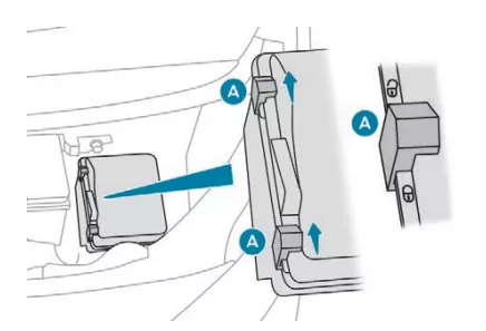 W komorze silnika, pod maską, po lewej stronie, obok akumulatora, znajduje się skrzynka bezpieczników i przekaźników. Przykład dostępu pokazano na schemacie.